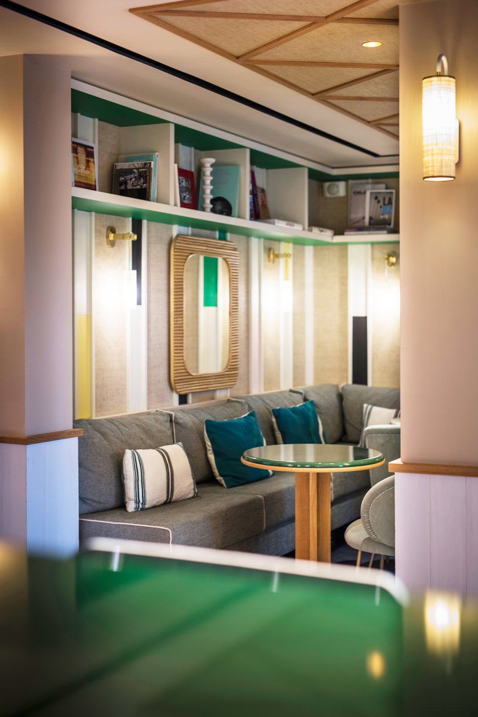 Carpentry work draws the eye to the headboards, topped with a bookcase and framed by bedside tables with colored backgrounds designed for the project.