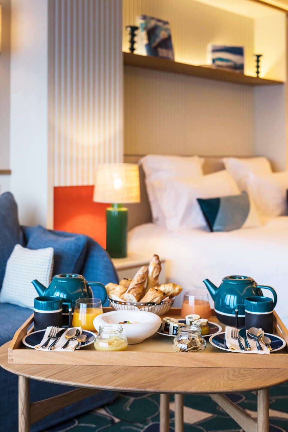 Each room vibrates with a unique, elegant and fresh atmosphere, which dialogues with the 18 others and meets the needs of a very eclectic clientele. The floors are adorned with a custom floral pattern, available in the brand's signature tones - blue and green.