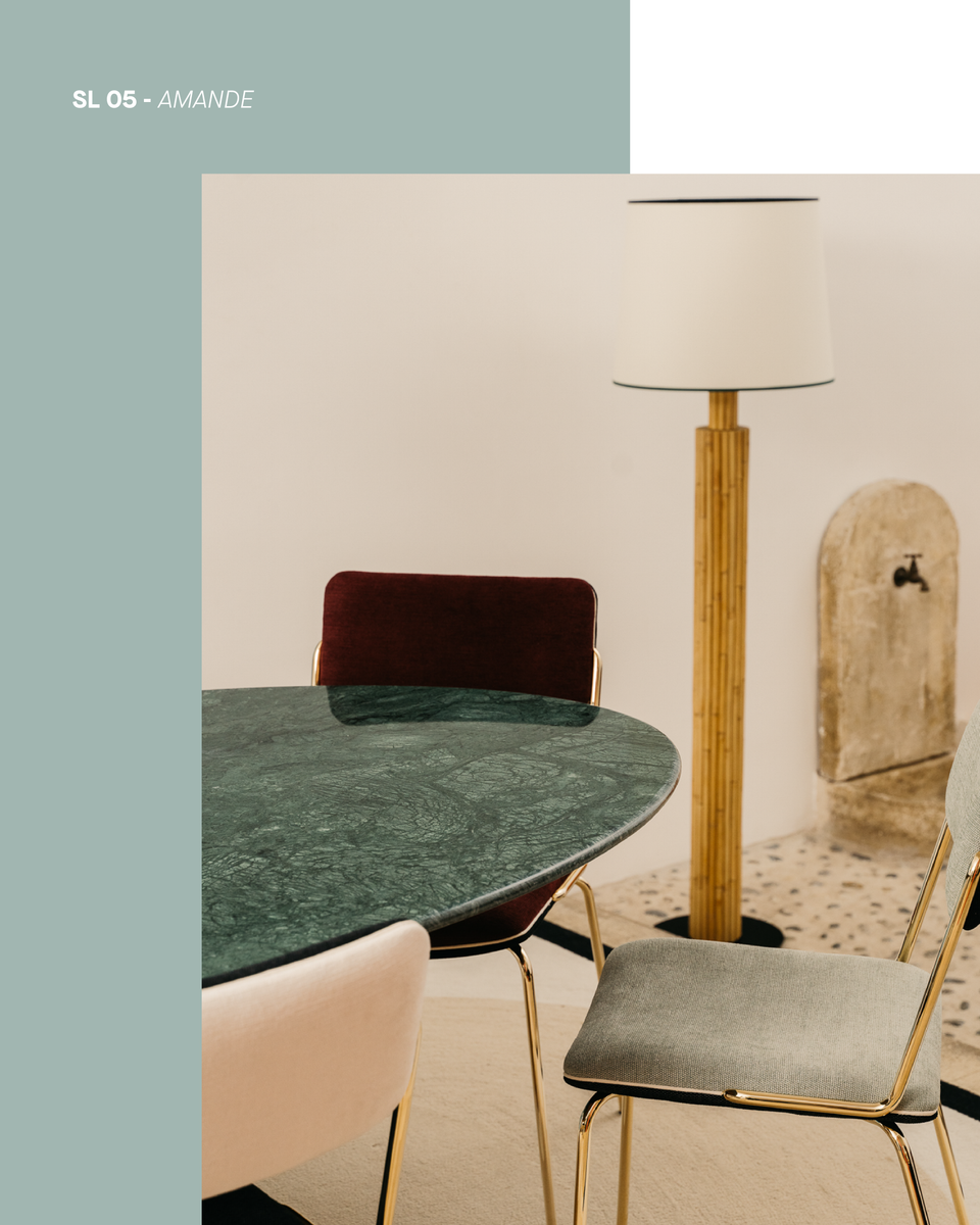 This shade of verdigris, slightly blue and muted, is a chameleon-like hue that reveals the complexity of one's face depending on the shades with which it is paired. Indoors, it is a soft and soothing color, as if watercolored.