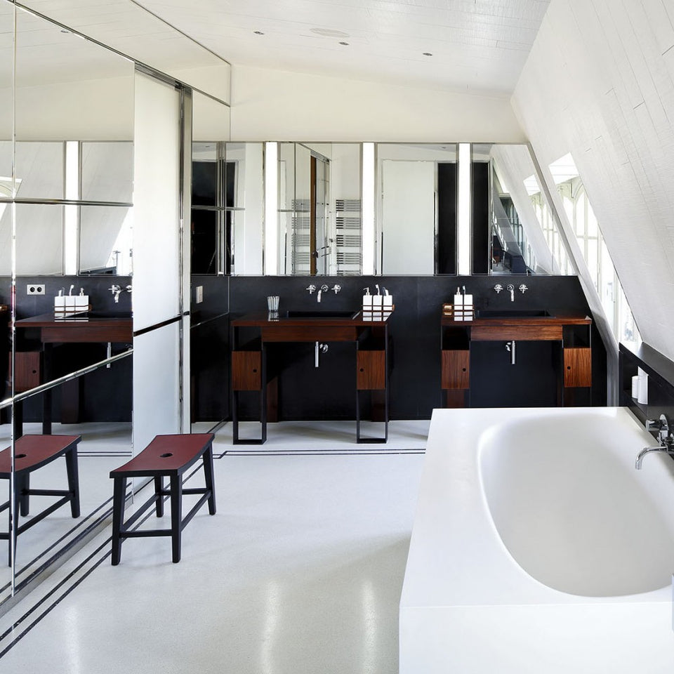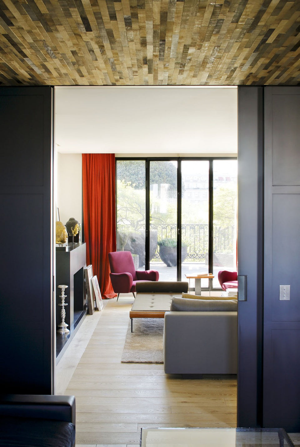 The great strength of the project was to open the apartment to the outside. Like a house on a roof, the facade of the roof of the 5th floor was completely opened with large workshop windows, in order to let in light and clear the view of the sky and the Invalides.