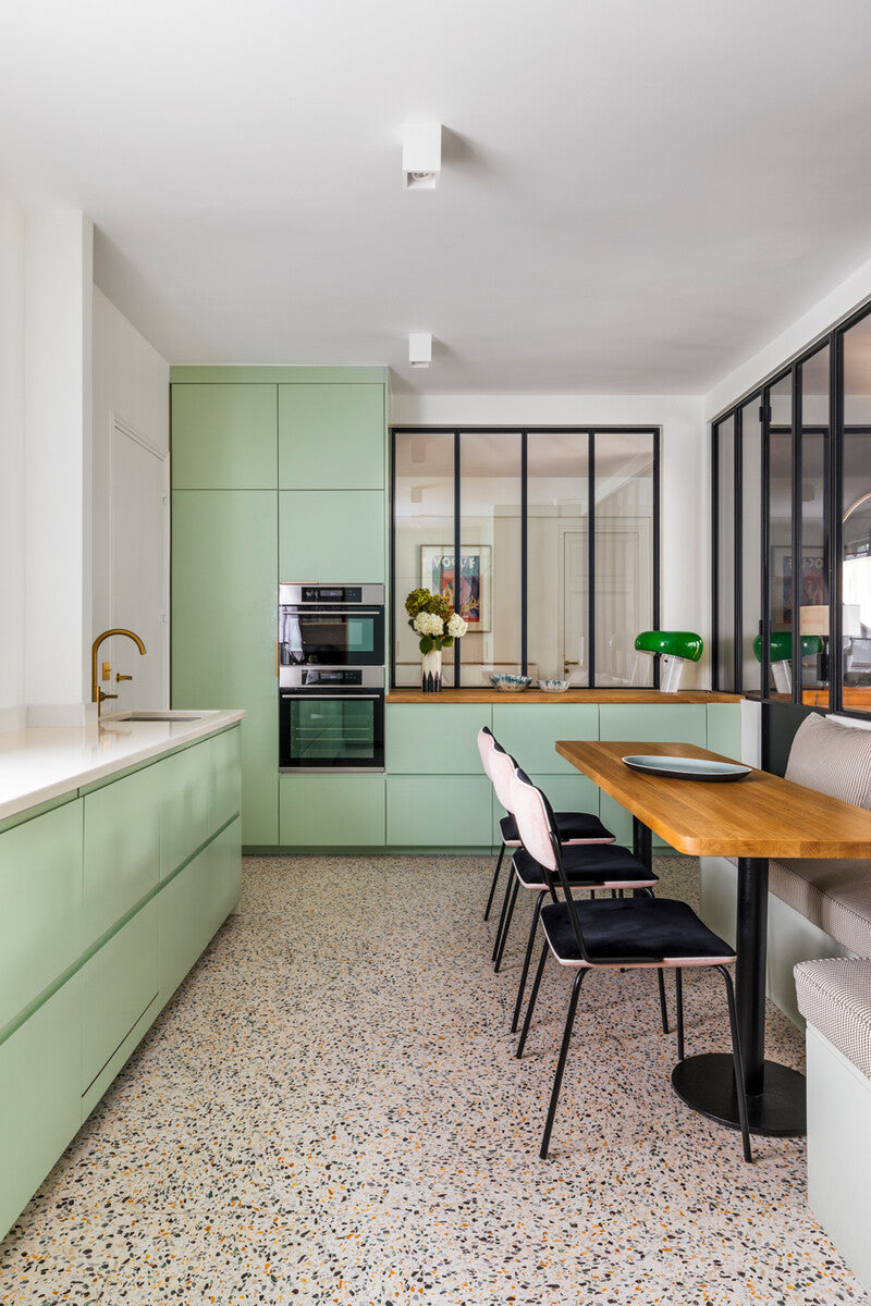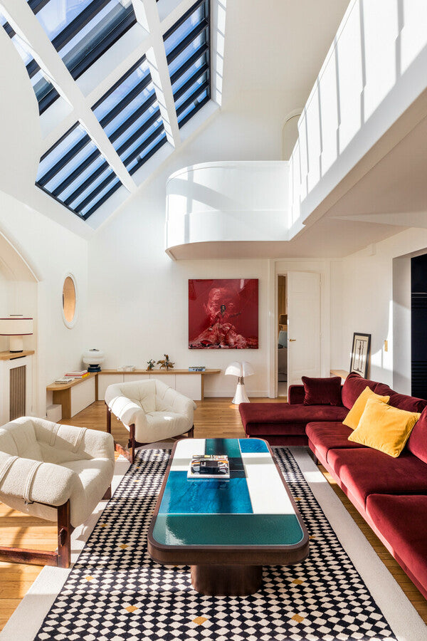Built in 1925, the charm of this former workshop designed by Paul Garofalo, an architect trained at the Beaux-Arts, lies in its volumes and its views of the rooftops and monuments of the capital. Dressed with the Dani coffee table and a Noa bench designed and made to measure, the living room is punctuated by Snoopy & Arco lights by Castiglioni. The kitchen-diner is home to the iconic Double Jeu velvet chairs, combined with a large marble table alongside the family buffet, kept for a vintage touch. A sublime transverse glass roof offers a unique skylight!