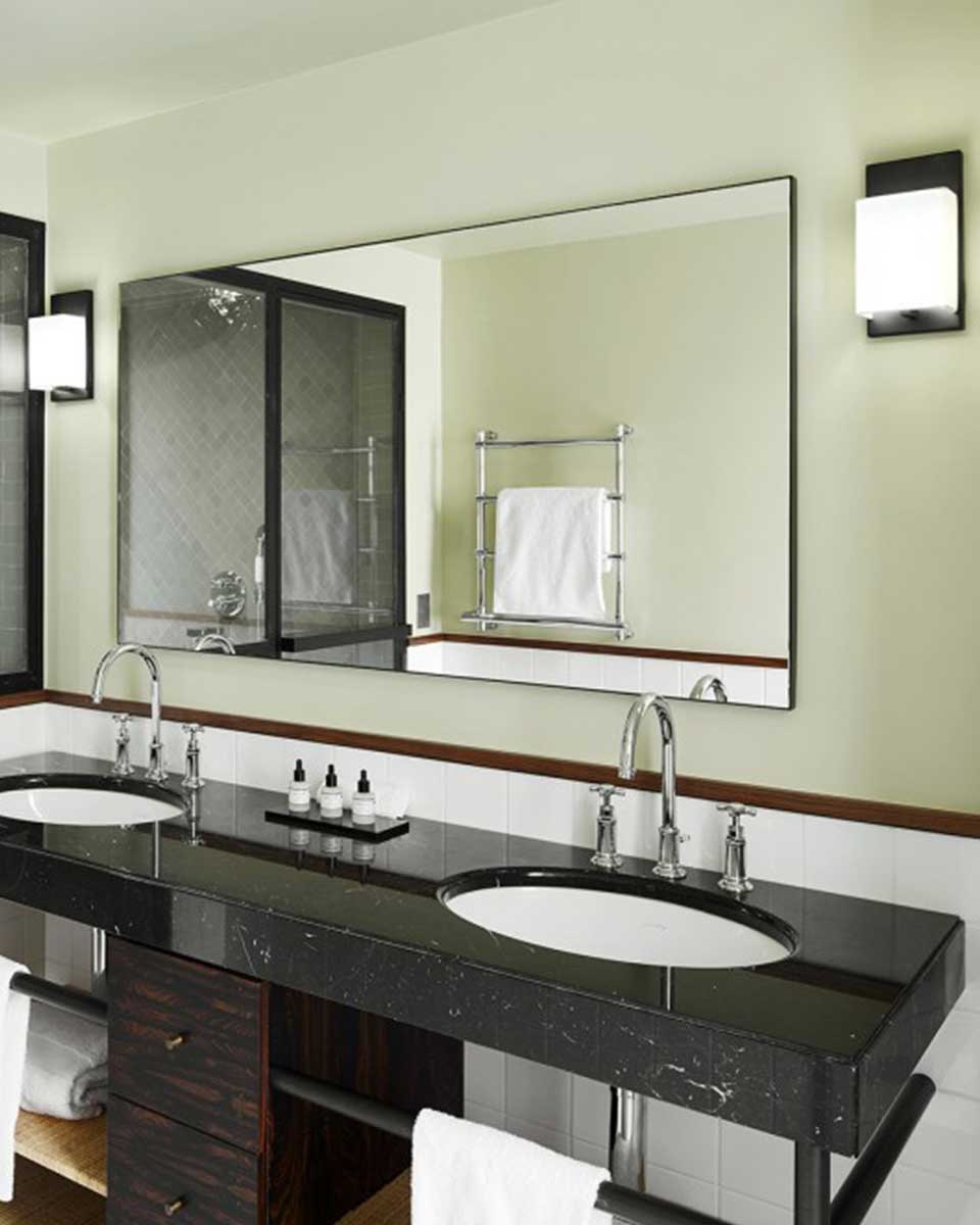 The white marble bathrooms are separated from the bedrooms by bay windows with interior shutters (opaque on the bedroom side, mirror on the bathroom side) allowing soft light to enter when the shutter is open. The showers with the sometimes integrated hammam are covered with soft-coloured eligs.