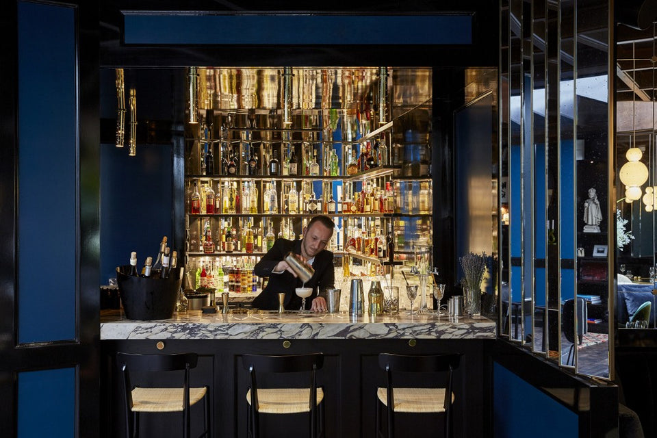 In the chic and relaxed extension of the lounge, a bar as delightful as a jewel box as well as a restaurant plunging onto a planted patio and a tree-lined terrace, a real lung between the two buildings of the hotel.