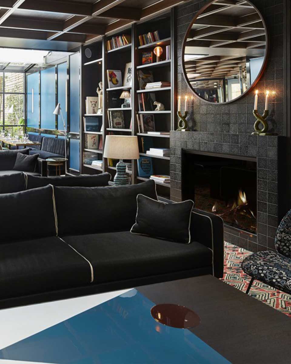 A few meters away, a large living room with a majestic library in which blends an enameled lava stone fireplace, surrounded by black sofas placed back to back and armchairs in flowered velvet. The atmosphere is hushed, with a concern for intimacy, a set of partitions in mirrors pivoting recto-verso, filters the light and the comings and goings of each. The different living spaces coexist as in a contemporary house.