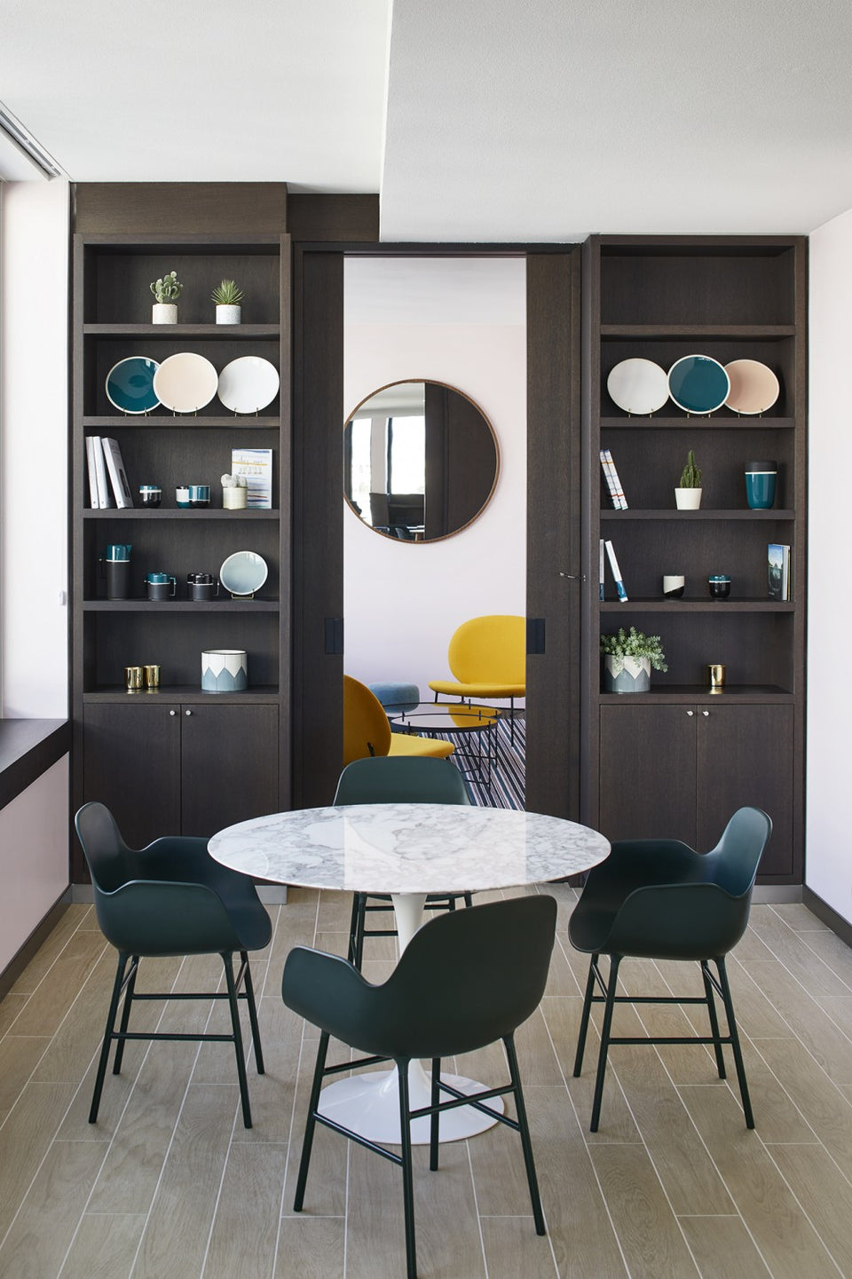 The offices and meeting rooms are functional and warm, decorated with touches of vibrant colors that make them unique. Varied atmospheres and lighting, including in the catering areas.