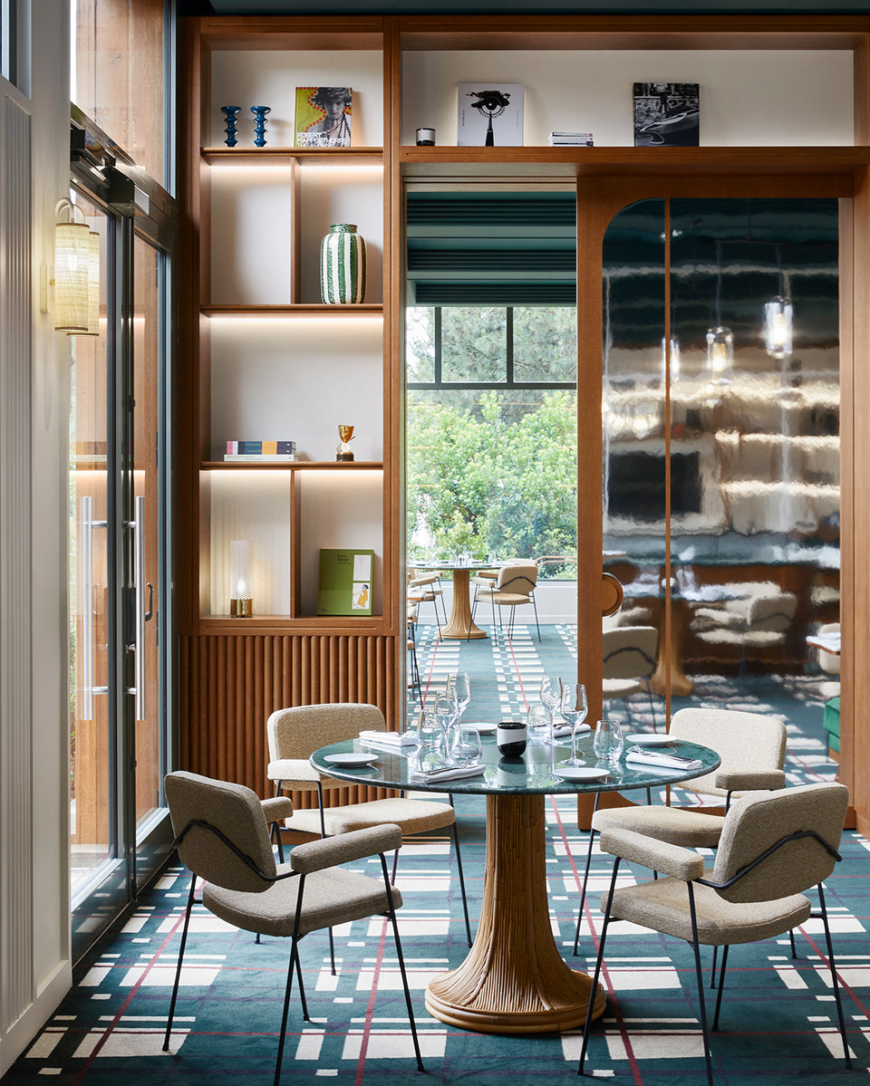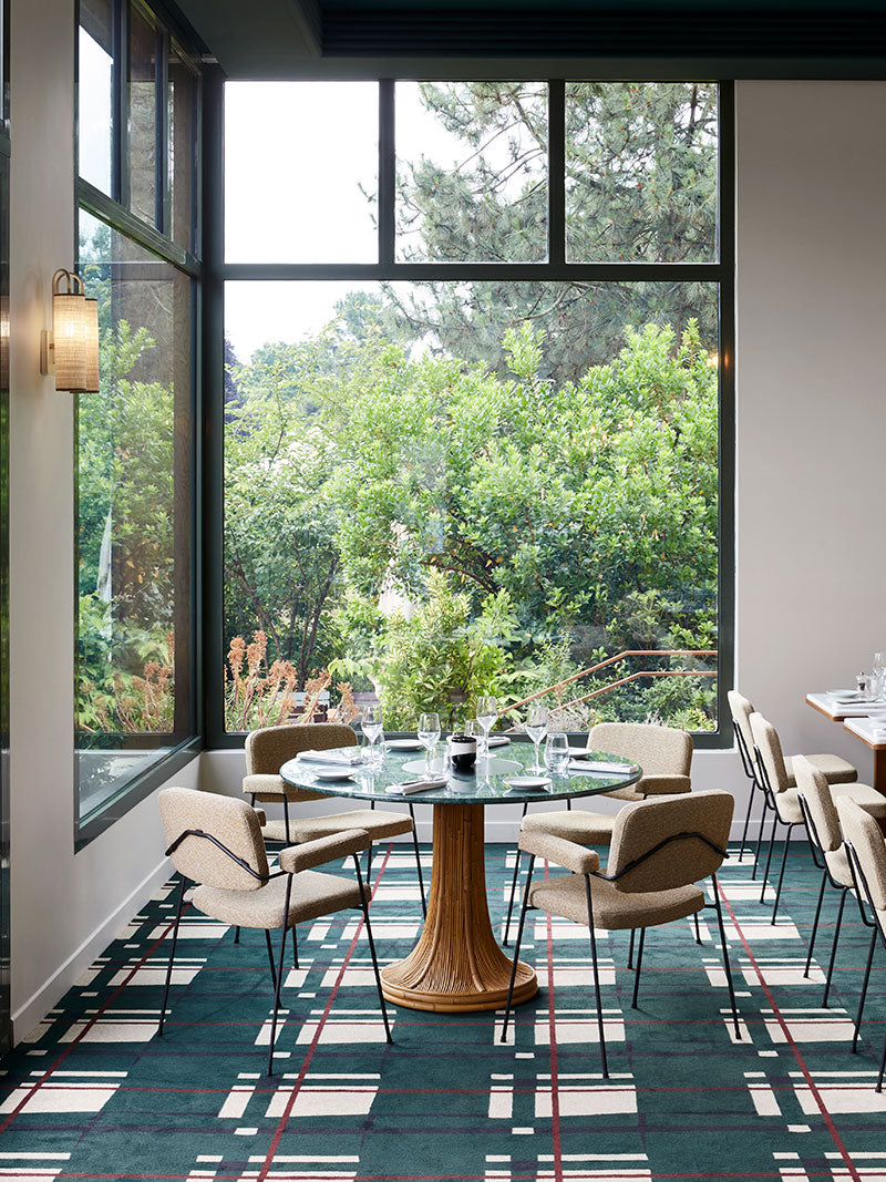 The restaurant is designed in the same spirit, with the tartan pattern of the carpet in a more contemporary version.
