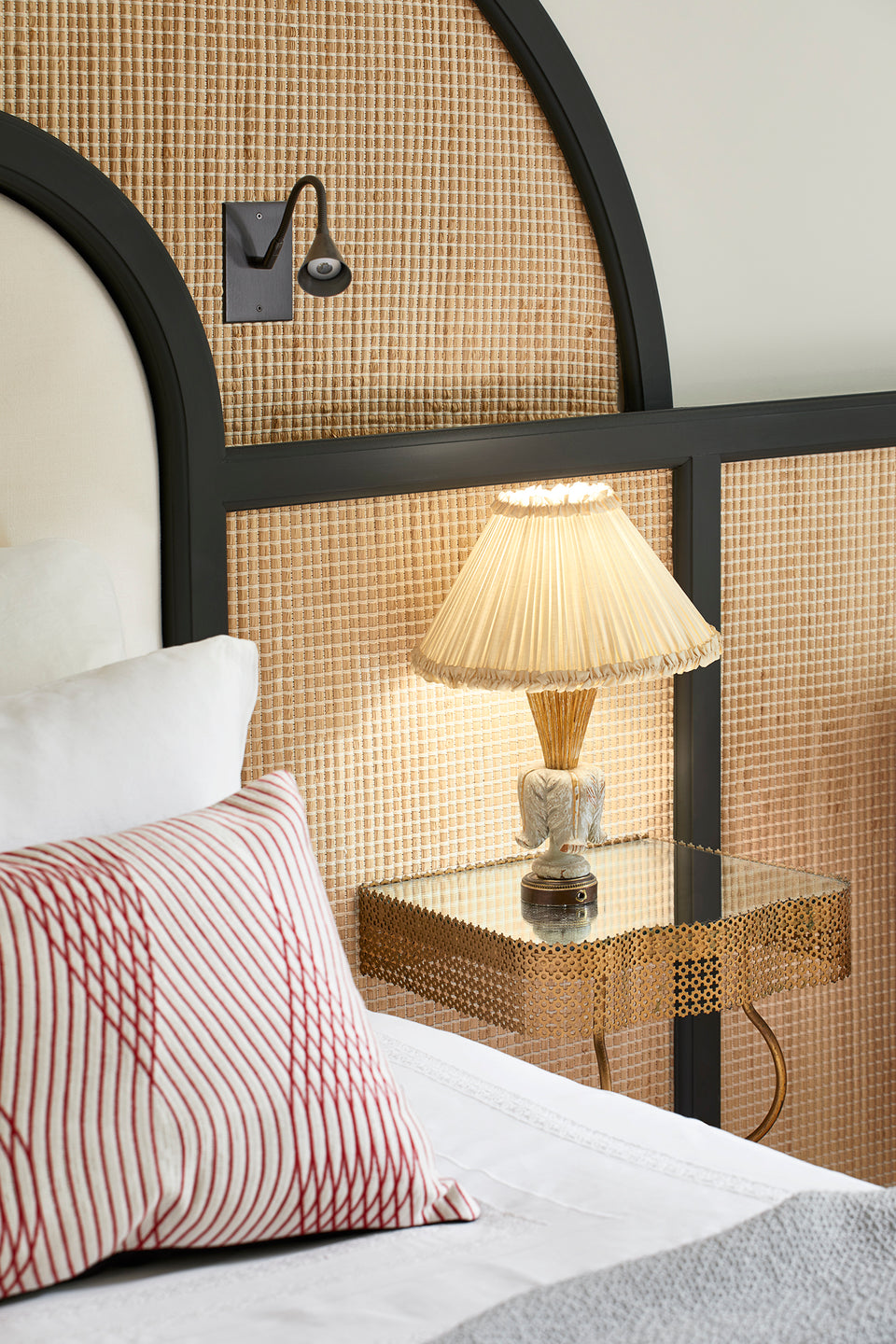 The bedroom is a bright and light refuge in which an imposing headboard in raffia and black wood has been designed. Pastel pink bench, thick green velvet curtains and vintage bedside tables: the mix of genres here is at the service of comfort and elegance.