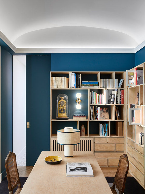 The layout of the living room is an illustration of a mastered mix and the assembly of different materials. The library open to the living room, made of birch, stands out against a luminous midnight blue. One of the ambitions of the project was to successfully combine the different styles and influences. The studio's objective was therefore to orchestrate this subtle association of vintage furniture, designer pieces, travel souvenirs, belonging to the owner, in a refined setting.